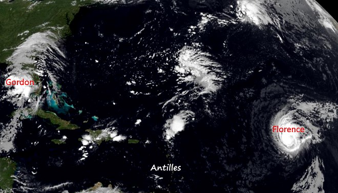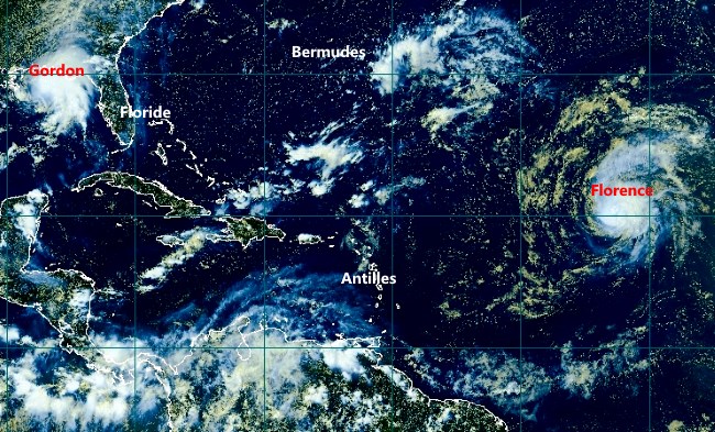 Après FLORENCE en Atlantique Nord, une tempête tropicale nommée GORDON s´est formée au Nord de Cuba. La 1ere continue sa route Nord-Ouest avec + de 50nds de vent et ne devrait donc pas concerner les Antilles. GORDON actuellement située dans l´Ouest de la Floride, est prévue faire route en direction de la Louisiane en se creusant! A suivre... EN SAVOIR +