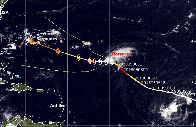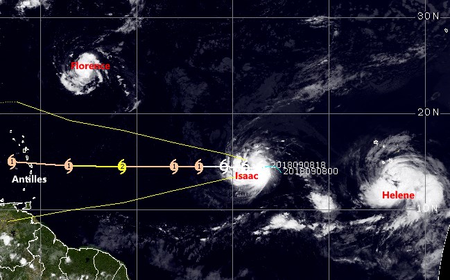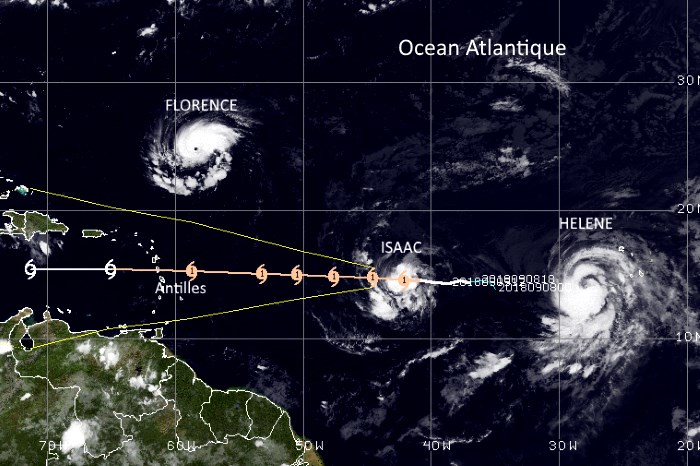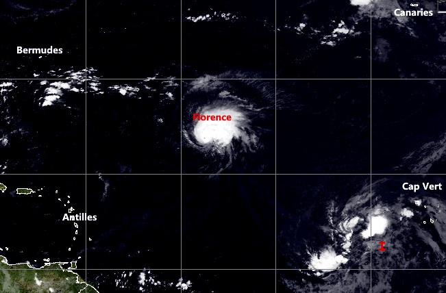Avec 65nds de vent ISAAC suit sa route Ouest en direction des Antilles ou il est attendu dans les 3 jours. L´ouragan FLORENCE fait route vers la côte Est des USA qu´il devrait toucher avec + de 110nds d´air à la frontière des 2 "Caroline" ou l´état d´urgence a été déclaré!!!! Dans le Sud-Ouest du Cap Vert Helene reste prévue incurver sa route vers l´Atlantique Nord... EN SAVOIR +