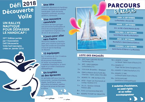Synonyme d’évasion et de liberté, la voile représente une formidable opportunité pour les personnes en situation de handicap de s’épanouir. C’est la raison pour laquelle l’association Défi Découverte Voile Sud Gascogne organise une nouvelle fois un rassemblement pour des personnes en situation de handicap et valides. Au total ce sont 13 voiliers et 130 personnes qui vont ainsi naviguer tout autour de la baie de La Rochelle du 10 au 14 septembre d... EN SAVOIR +