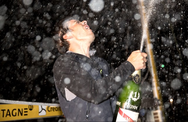 Solitaire Urgo-Le Figaro 2018: Après 2 jours et 14 heures de nav, Sébastien Simon a remporté cette 2ème étape de la course entre Saint-Brieuc et la Ria de Muros-Noia. Arrivés 20 minutes + tard, Xavier Macaire et Eric Péron complètent le podium. Sébastien Simon s’empare du leadership de la course. Photo: A.Corcoux EN SAVOIR +